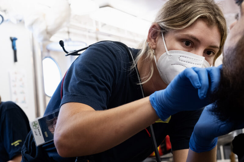 Die Person in der Rolle als Rettungssanitäterin oder Pflegeperson ist Teil des 4-köpfigen medizinischen Teams, bestehend aus Ärztin, Rettungssanitäter*in oder Pflegeperson, Hebamme und psychologischer Vertretung. Das medizinische Team ist Teil des Pflege-Teams an Bord und wird während des Einsatzes von der Pflege-Koordination (CareCo) beaufsichtigt.